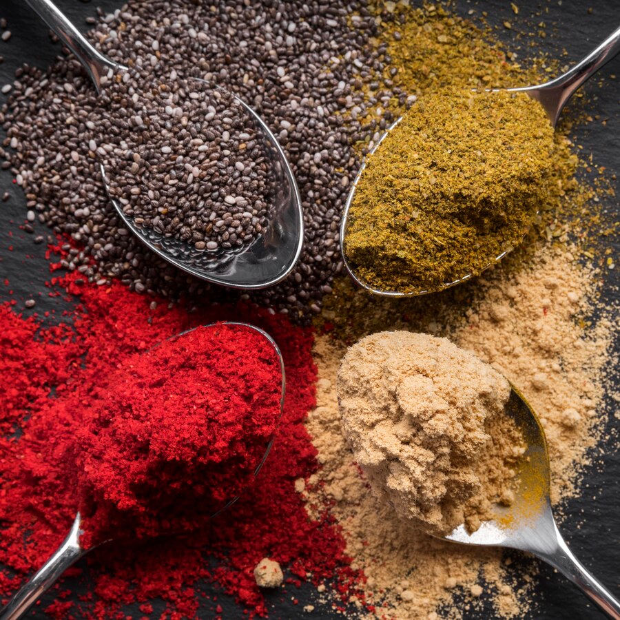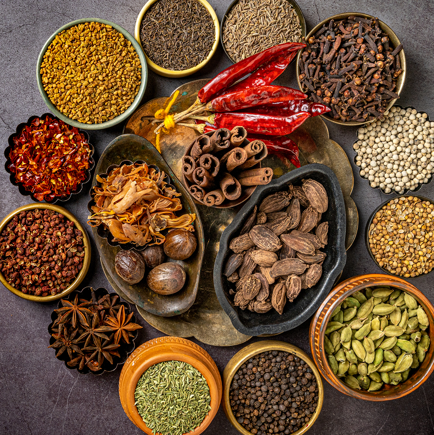 A global collection of aromatic coffee beans, vibrant spices, rich cocoa pods, and wholesome dried f